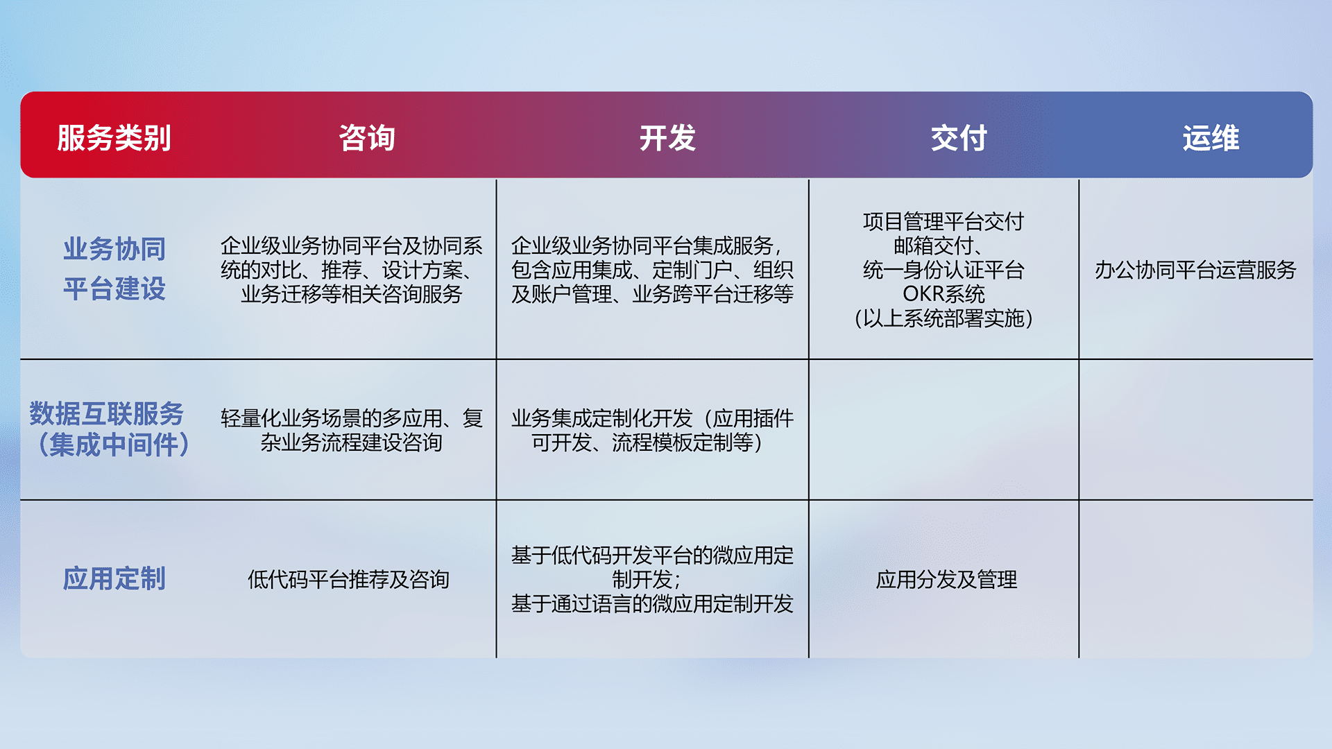 针对钉钉、、、、企微、、、、IDaas等平台级产品提供产品的规划、、、方案、、、交付、、、定制化开发等服务,,,,实现如统一协同办公、、、智能客户服务、、、混合会议管理、、、智能数据查询、、、、等业务场景,,,实现数字化转型。。